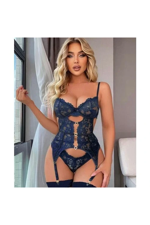 Arias Closet Kalp Aksesuarlı Dantelli Fantezi Mavi Jartiyer Takım