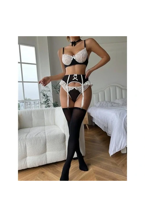 Arias Closet Özel Tasarım Siyah-Beyaz Dantelli Fantezi Jartiyer Takımı