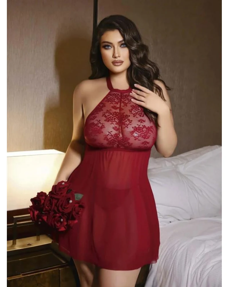 Bordo Dantel İşlemeli Göğüs Dekolteli Boyundan Bağlamalı Fantezi String Tül Gecelik Takımı