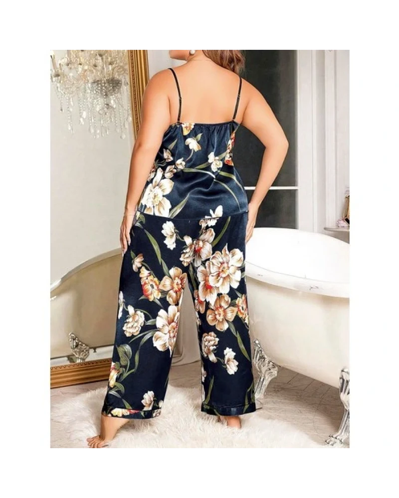 Arias Closet Büyük Beden Mavi Üstüne Çiçek Desenli Ince Askılı 2'li Saten Pijama Takımı