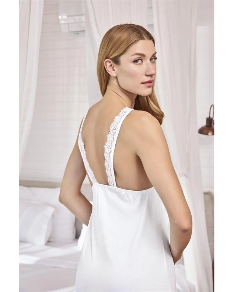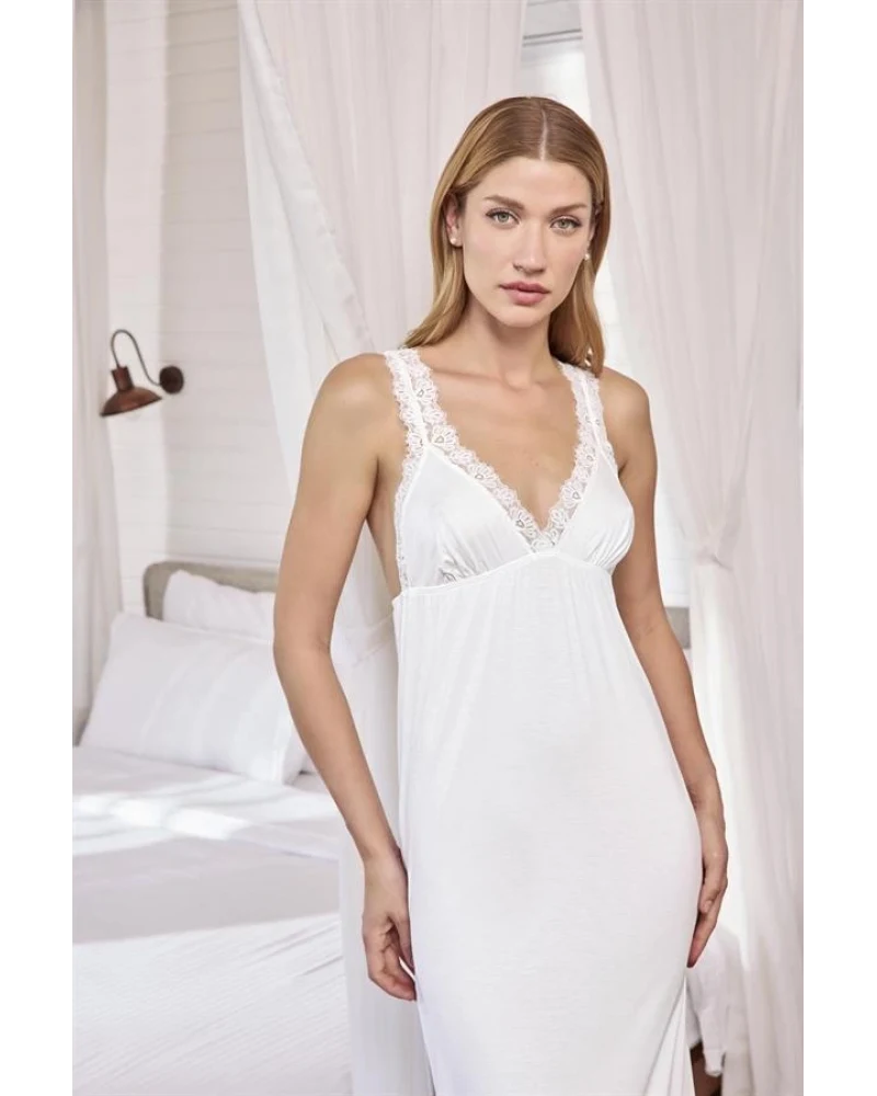 Gecelik: Beyaz renklidir, derin V Yakalıdır, göğüs ve sırt dekoltelidir, ip askılıdır, yakası, göğüs ve askı kenarları dantellidir, yırtmaçlıdır, örme kumaştır.