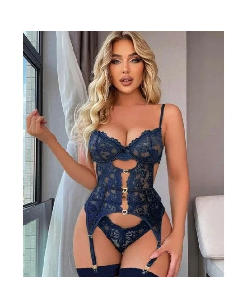 Arias Closet Kalp Aksesuarlı Dantelli Fantezi Mavi Jartiyer Takım