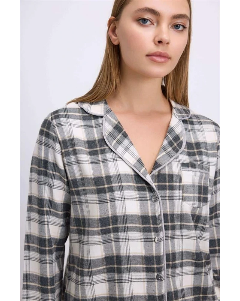 Kış gecelerinin vazgeçilmezi olmaya aday bu pijama takımı, flanel görünümlü kumaşı sayesinde sıcak tutarken yumuşacık dokusuyla maksimum rahatlık sunar. Klasik kareli desen, ev şıklığını zamansız bir tarzla buluşturur. Uzun kollu üst ve rahat kesim pantolon ile soğuk günlerde stil sahibi bir konfor sağlanır.