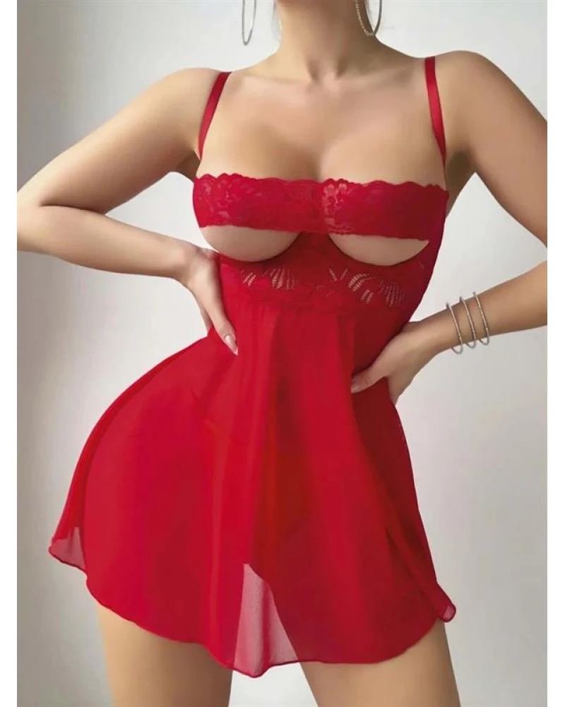 Kırmızı Dantel İşlemeli Göğüs Dekolteli Fantezi String Tül Gecelik Takımı