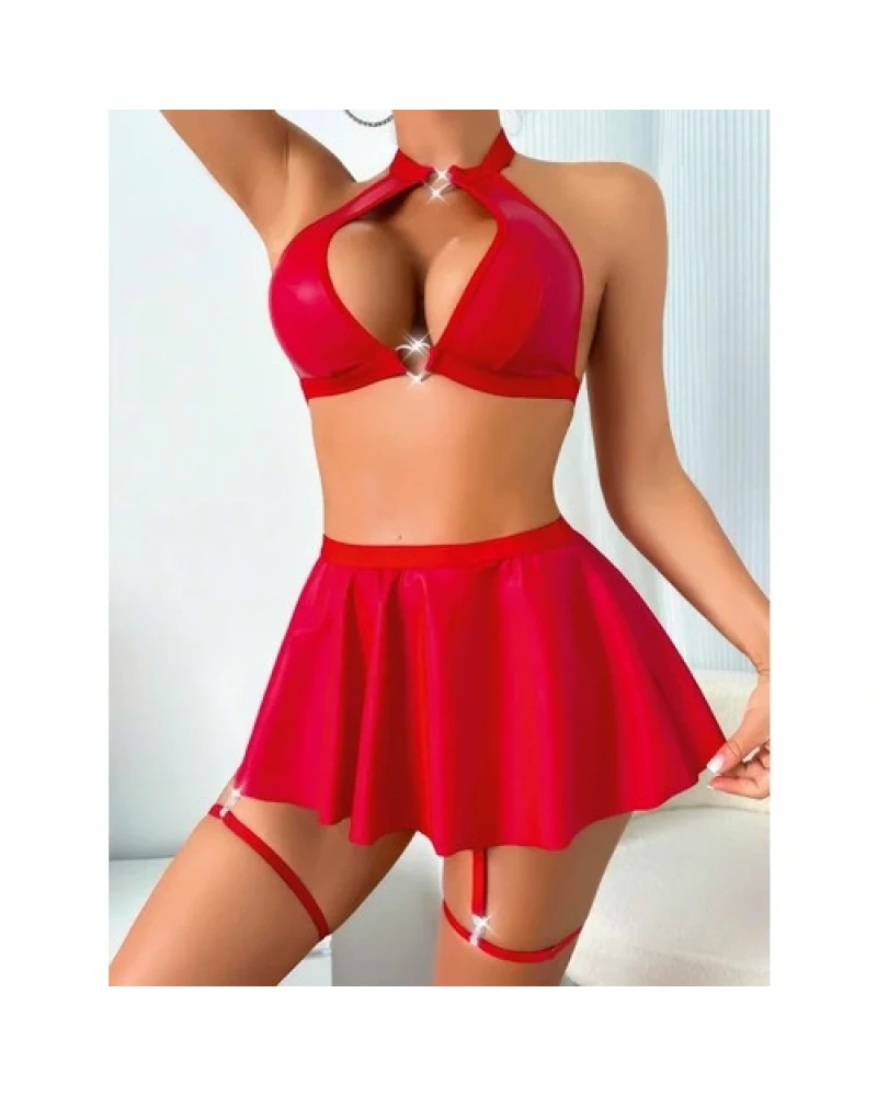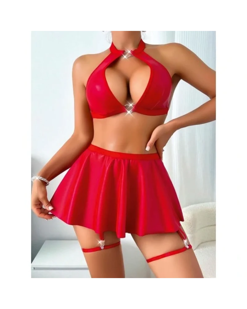 Arias Closet Kırmızı Dekolteli Etekli Boyundan Bağlamalı Fantezi Parlak Deri Kostüm