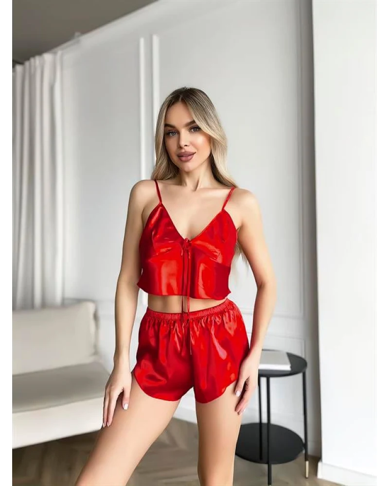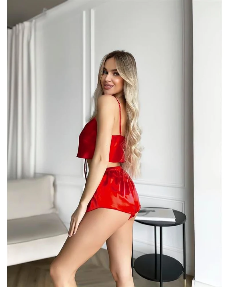 ❤️ Kırmızı İnce Askılı Saten Şortlu Takım ❤️