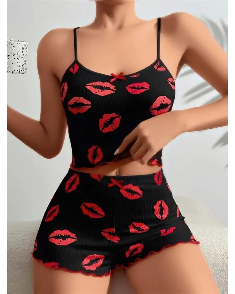 ?? Pamuklu Kiss Öpücük Desenli Siyah Fitilli Şortlu Pijama Takımı