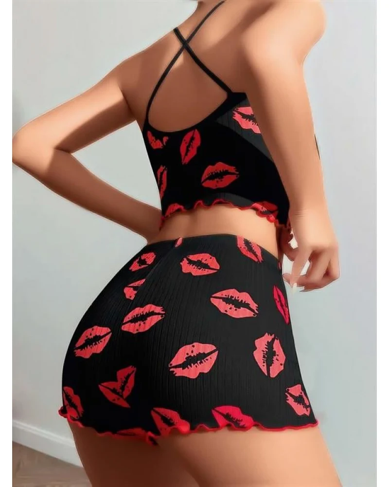 Arias Closet Pamuklu Kiss Öpücük Desen Siyah Fitilli Şortlu Pijama Takımı