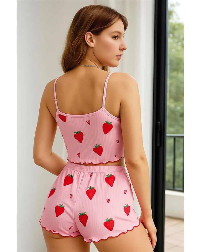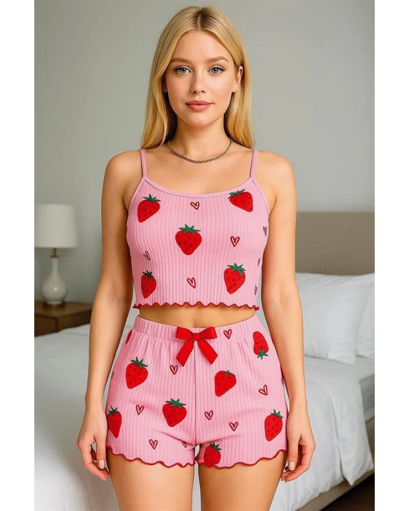 ?? Pamuklu Pembe Üstüne Çilek Desenli Fitilli Askılı Şortlu Pijama Takımı