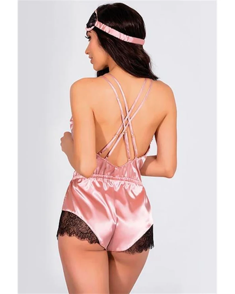 ? Pembe Dantelli Sırtı Çapraz Saten Şort Tulum ?