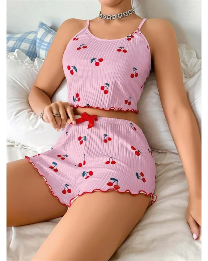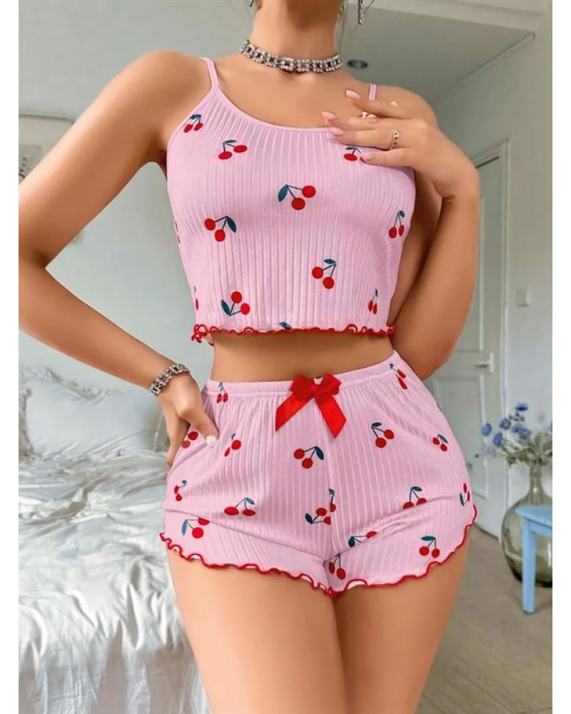Arias Closet Pembe Kiraz Desenli Askılı Şortlu Pijama