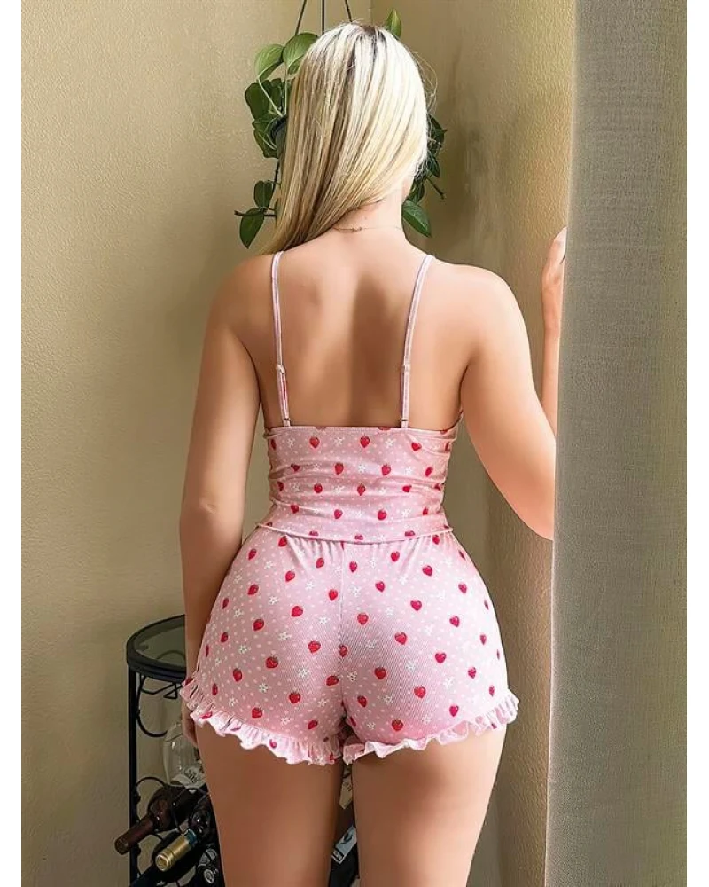 Rahatlığın tatlı bir dokunuşla buluştuğu bu pijama takımı, yumuşak pembe rengi üzerine çilek desenleriyle enerji dolu ve sevimli bir görünüm sunar. İnce askılı üst ve rahat kesim şortuyla hem konforlu hem de genç ve fresh bir stil oluşturur. Günlük kullanım, ev rahatlığı ve keyifli uyku saatleri için mükemmel bir seçimdir.