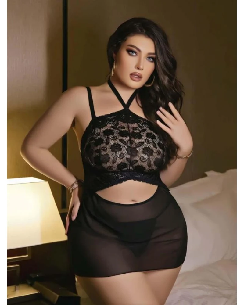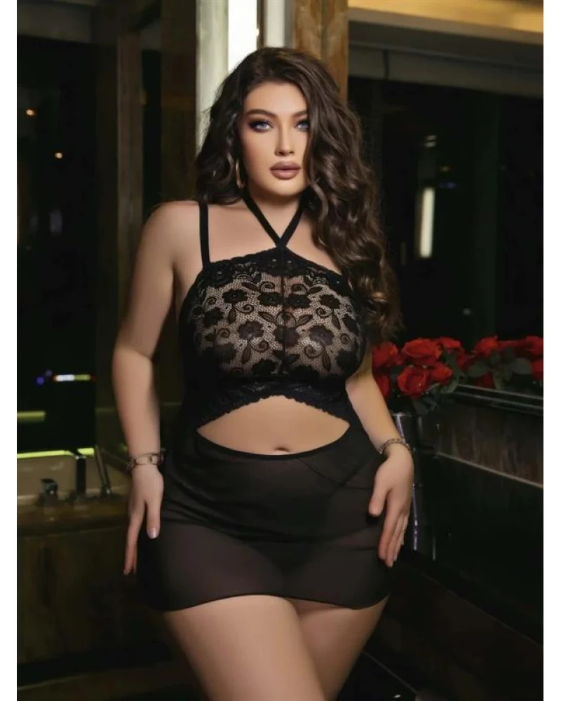 Boyundan bağlamalı tasarımı ve derin göğüs dekoltesiyle göz alıcı bir silüet sunan bu özel tül gecelik takımı, zarafeti ve cesareti aynı anda taşımak isteyenler için tasarlandı.