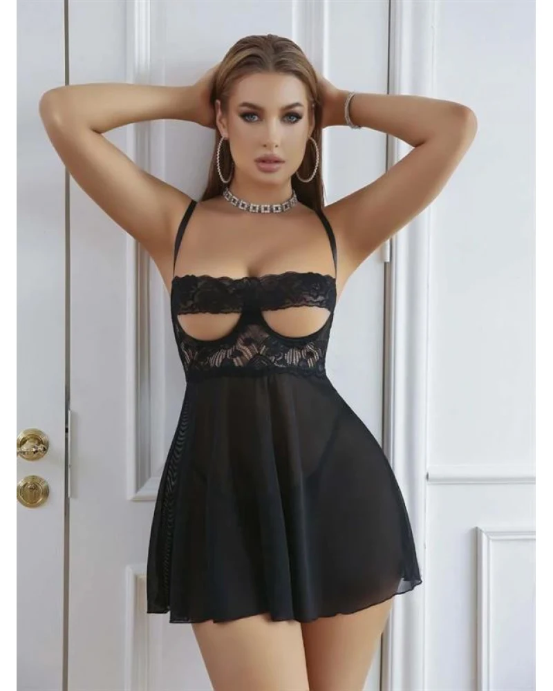 Siyah Dantel İşlemeli Göğüs Dekolteli Fantezi String Tül Gecelik Takımı
