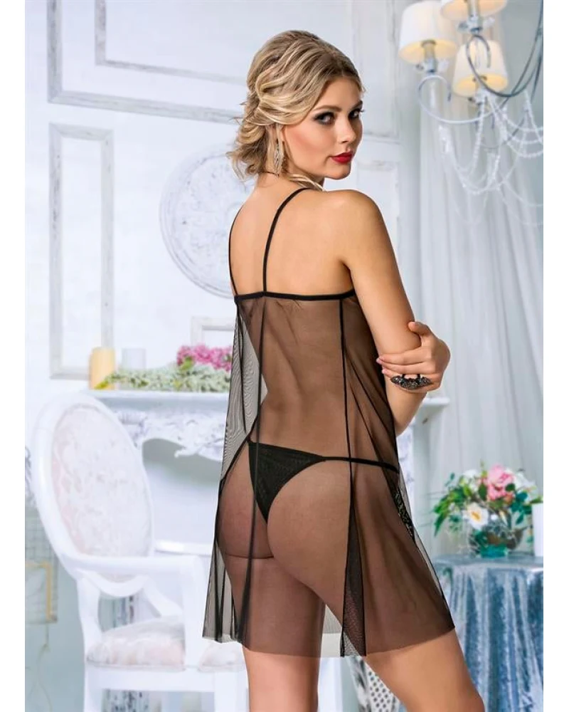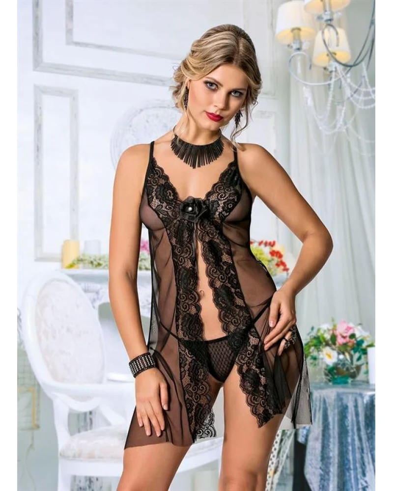 ? Siyah Dantel İşlemeli Önden Yırtmaçlı Fantezi Tül Gecelik Takımı ?