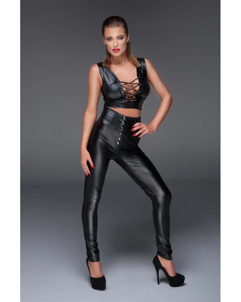 Bu iddialı fantezi tulum, parlak siyah deri görünümüyle vücudu sararak feminen hatları vurgular. Göğüs veya bel bölgesindeki cesur dekoltesiyle sınır tanımayan bir şıklık sunar. Esnek yapısı sayesinde hem rahat hem de etkileyici bir deneyim yaşatır.