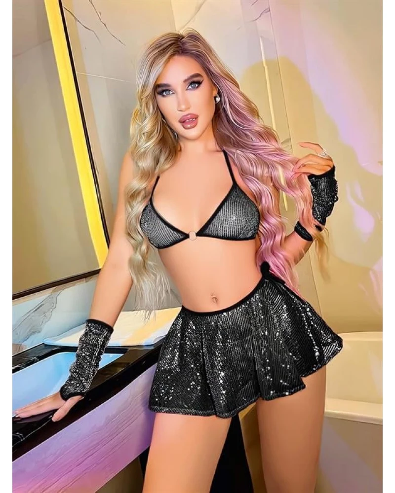 Gecenin ışıltısını yansıtan bu özel takım, parlak kumaş dokusu ve cesur kesimiyle göz alıcı bir stil sunuyor. Vücudu saran parlak sütyen, şıklığı ön plana çıkarırken; mini etek detayıyla feminenliği zirveye taşıyor. Hem iddialı hem enerjik bir görünüm arayanlara özel…