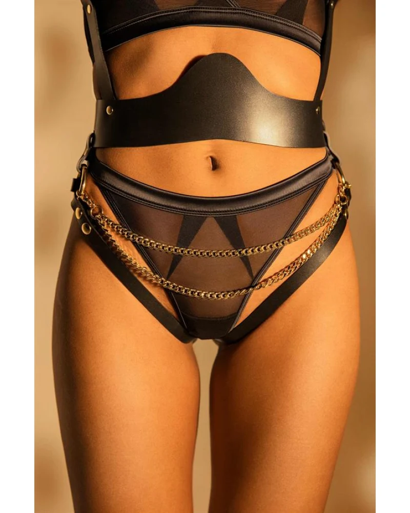 Siyah derinin sert dokusu, parlak zincir aksesuarlarda buluşuyor. Bu harness, asi ruhunu dışa vurmak isteyen cesur kadınlar için tasarlandı. Derinin dayanıklılığı ve zincirin asi parıltısı ile gecenin en dikkat çekici parçası olmaya hazır.