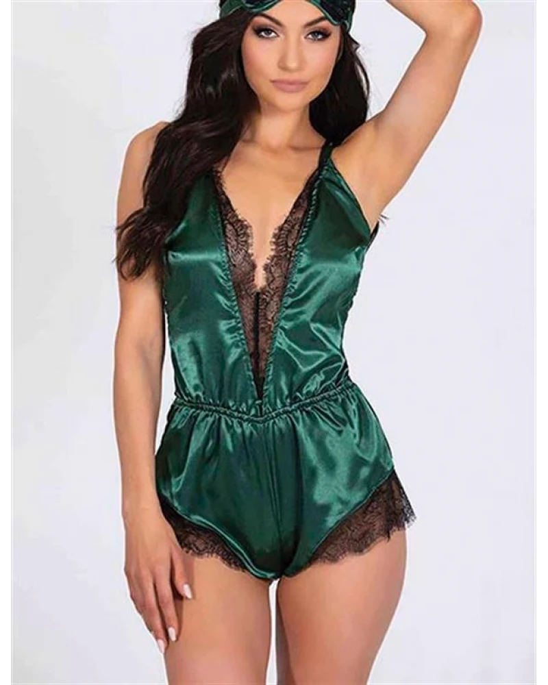 ? Yeşil Dantelli Sırtı Çapraz Saten Şort Tulum ?