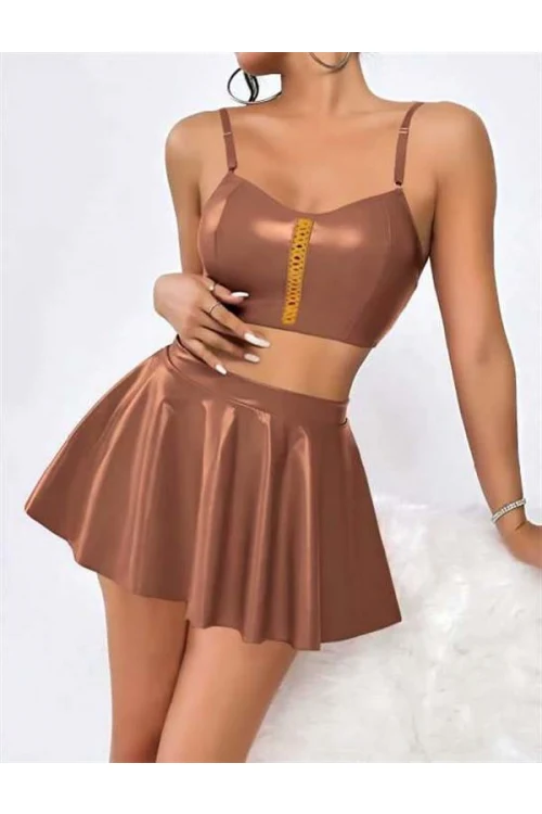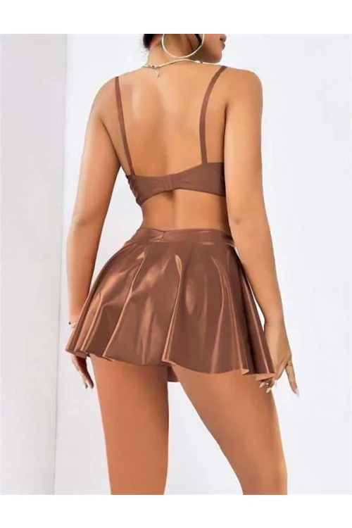 Arias Closet Kahverengi Etekli Pileli Fantezi Deri Elbise