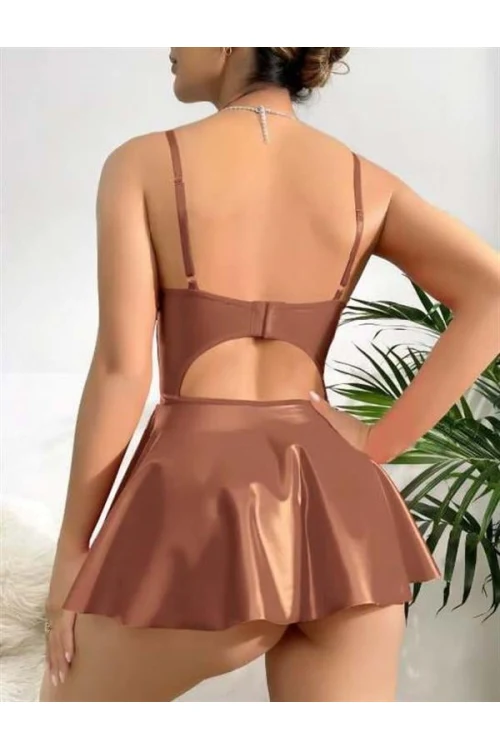 Arias Closet Kahverengi Etekli Fantezi Deri Şık Elbise