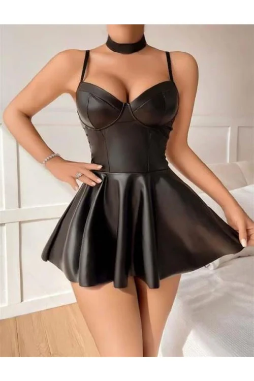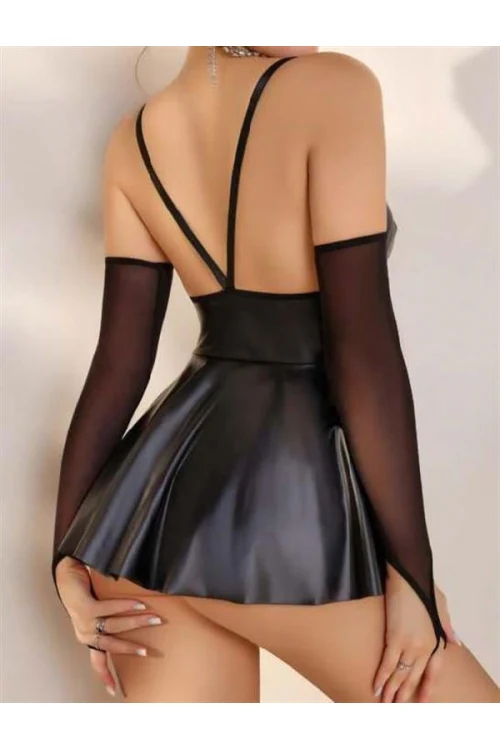 Arias Closet Siyah Etekli Fantezi Deri Elbise