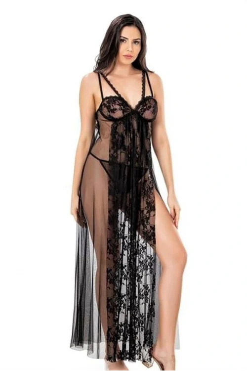 Arias Closet Siyah Dantel İşlemeli Göğüs Dekolteli Fantezi String Tül Gecelik Takımı